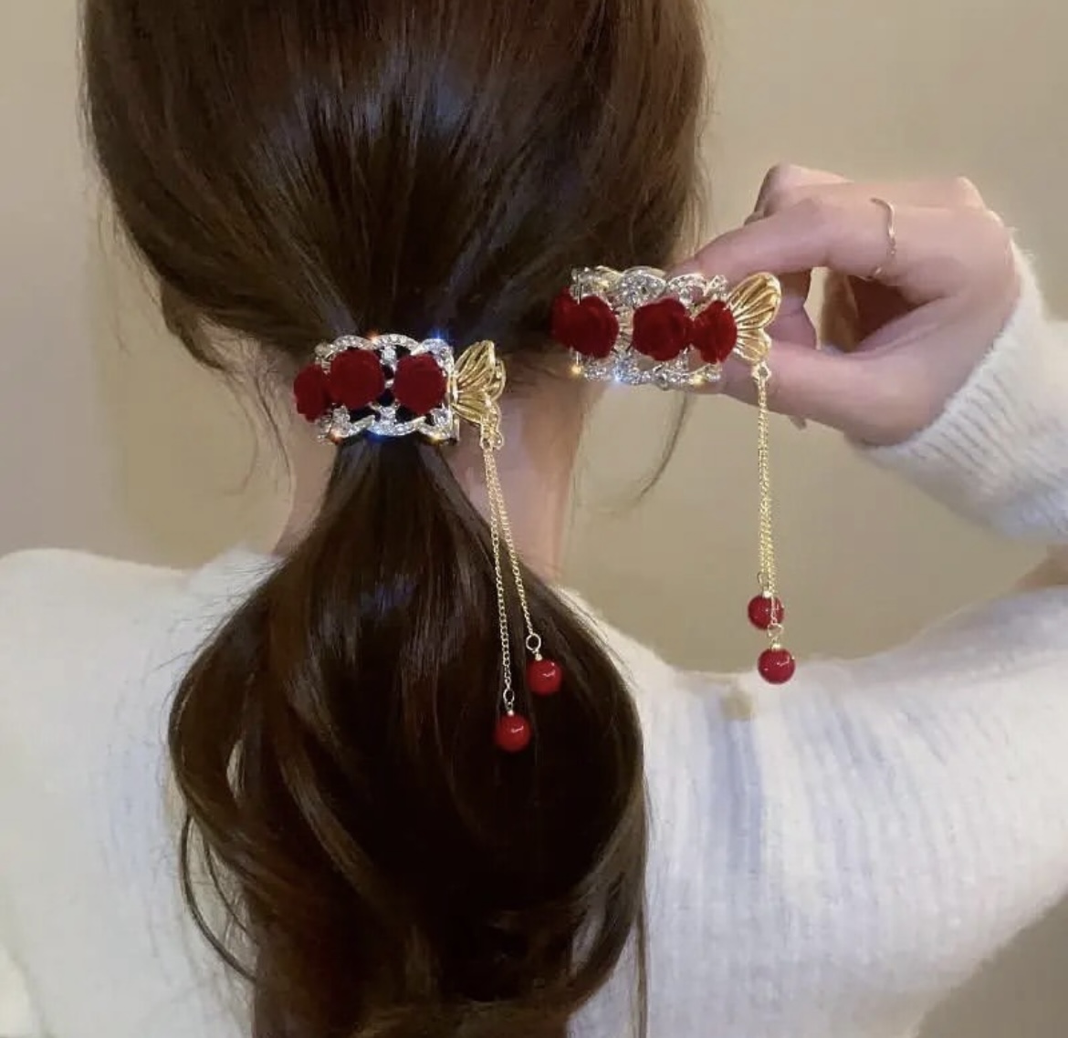 • تزئینات: نگین و گل قرمز